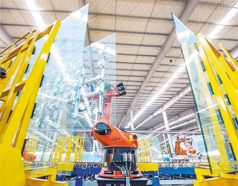 浮法玻璃出产线机械手取片系统正在从动堆垛玻璃。